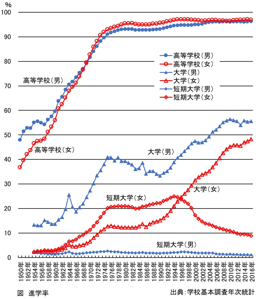 1960年代は経済の活況を背景に人手不足が強まりました。ただし技術革新などに柔軟に対応できる若い人材が求められる傾向があり、求人が多い反面で、変化に対応できないものは失業することもありました。求人の中心は中学卒、高校卒へと移っていきました。団塊の世代が中学を卒業し始めた1962年の求人倍率は、中学卒が2.9倍、高校卒が2.7倍となっています。高校進学率は1960年代に60%を超え、1970年代には80%を超えるようになりました。さらに1963年の「労働経済の分析」[*4-2]では、「求人がなお若年齢層に偏る傾向が引き続いているほか、技術者、技能者に対する需要も強いため、・・・全般的な求職者の漸減基調と相まって求人条件にかなう紹介対象の範囲を量質両面から著しくせばめるとともに、採用選択の余地を少なくしている」と指摘されています。人材の能力への要求水準が次第に高くなっていったといえます。
