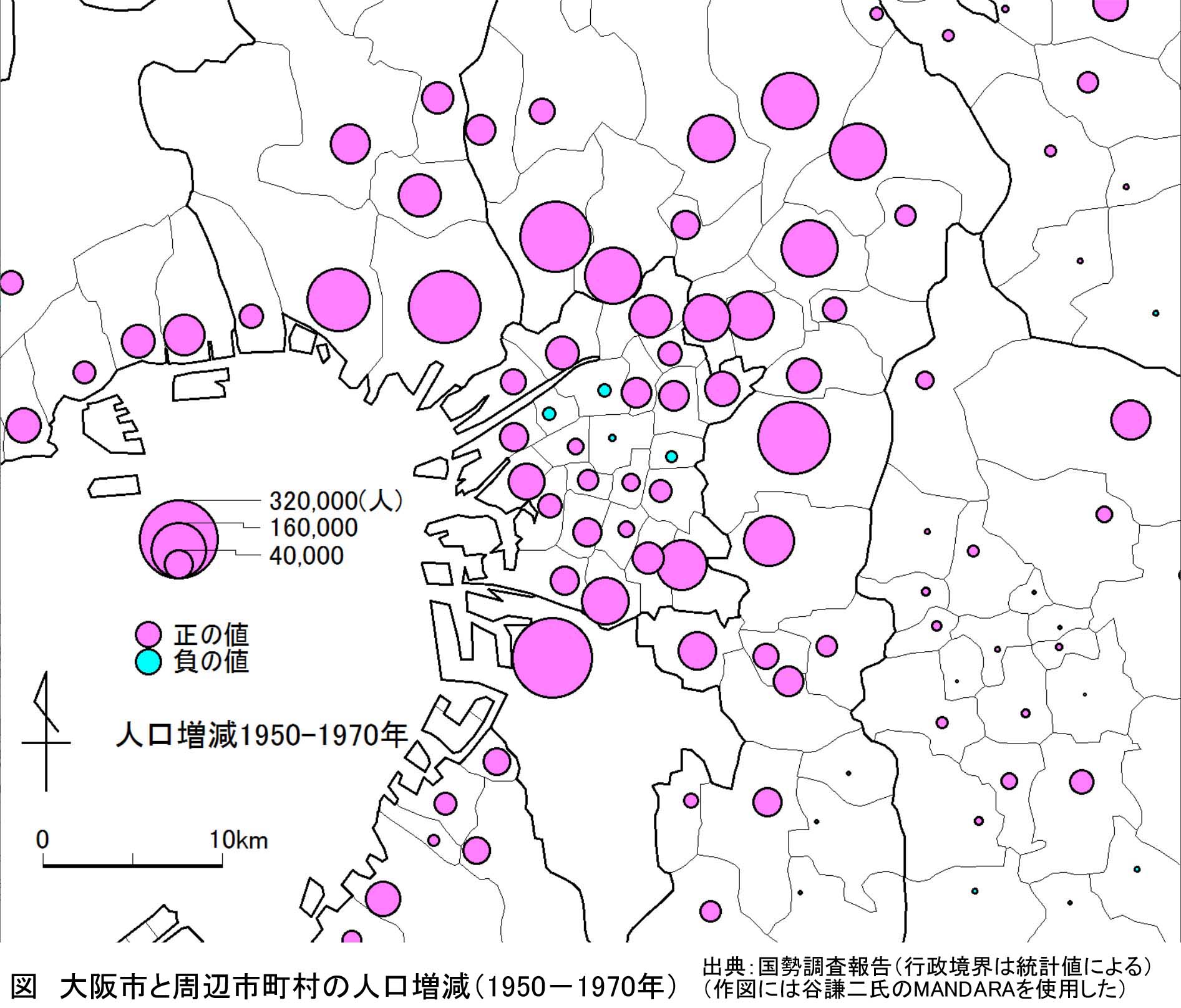 | 図 大阪市と周辺市町村の人口増減(1950-1970年) |
