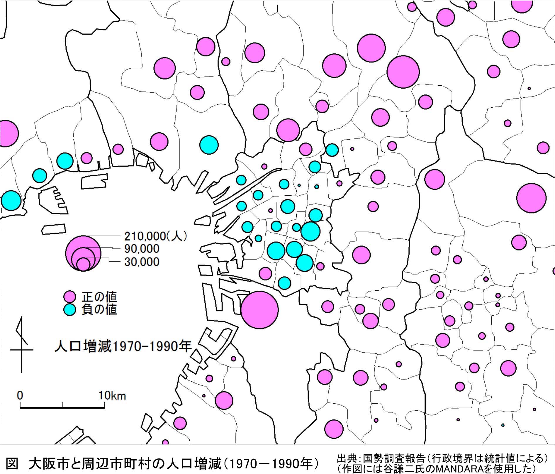 | 図 大阪市と周辺市町村の人口増減(1970-1990年) |