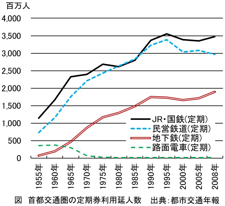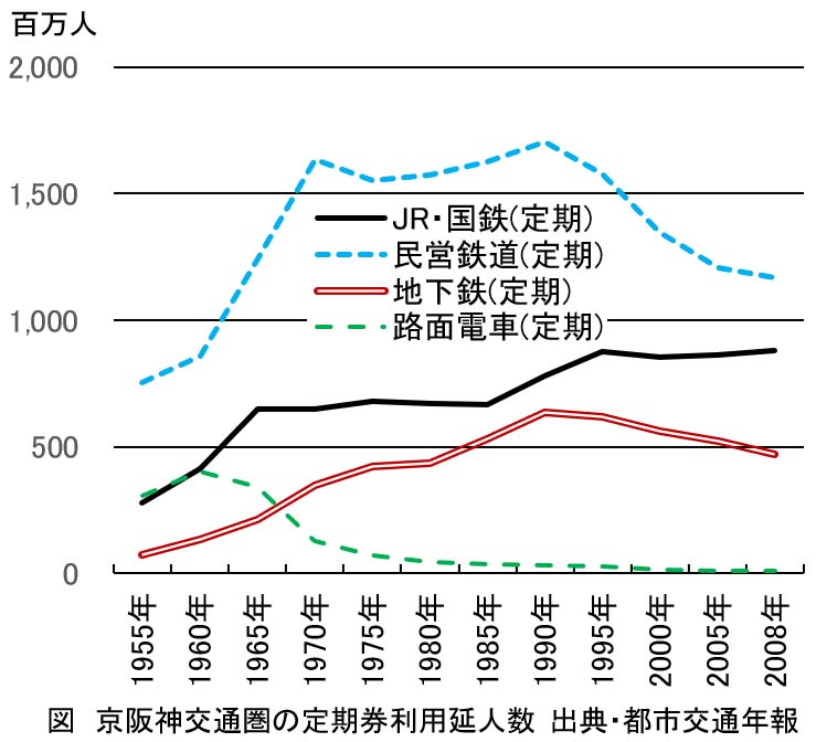 国鉄と民営鉄道の定期利用の旅客輸送人員は、首都交通圏では1955年に19億人でしたが、1960年に28億人、1970年に46億人、1990年に105億人となり、1995年には140億人に達し、その後は伸び悩んでいます。京阪神交通圏では、1955年に10億人、1970年に28億人に増加しましたが、その後にはさほど増加せず、2000年からは減少しました。
