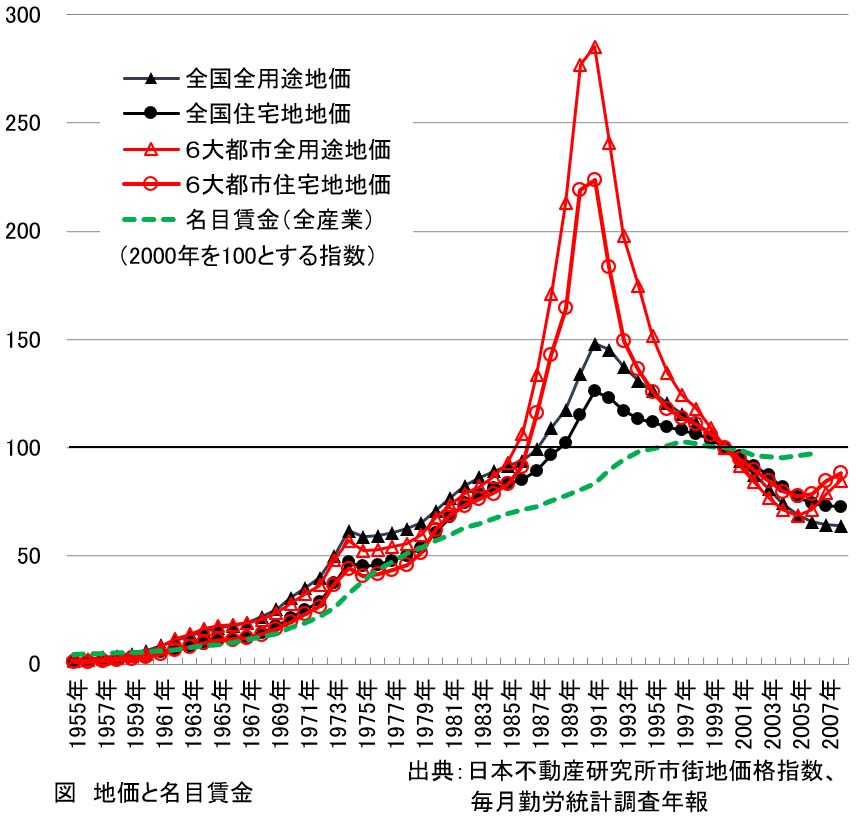 高度経済成長期の前半、1955年から1965年に給与水準は約2倍になりました。1960年に池田内閣が掲げた所得倍増計画は1961年からの10年間で所得を倍増するとうたいましたが、当時の経済状況からみるとむしろ控えめだったといわれています[*6-17]。人びとは所得が増えるにつれて豊かな生活はもちろん、よりよい住宅を求めるようになりました。しかし1955年から1965年にかけての10年間に、住宅地価は全国で7倍、6大都市では約10倍に上昇しました。所得が倍増しても地価上昇には追いつきません。