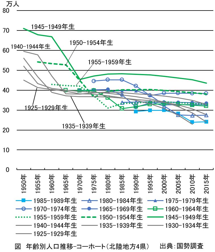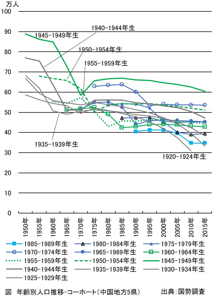 国勢調査によれば、東北地方や北陸地方、中国地方、四国地方、九州地方では、いったんは減少していた1940年代生まれの人口が、30歳前後に達した1975年に増加に転じています。ただし大都市圏以外で産業が蓄積していたとみられる宮城県や茨城県、栃木県、群馬県、岡山県、広島県などでは、1975年時点で、転勤を含むとみられる40歳前後の人口も、わずかに増加しています。その後バブル経済期後の1990年代にも地方へのUターン現象がみられますが、いずれも30歳前後の人口が中心です。