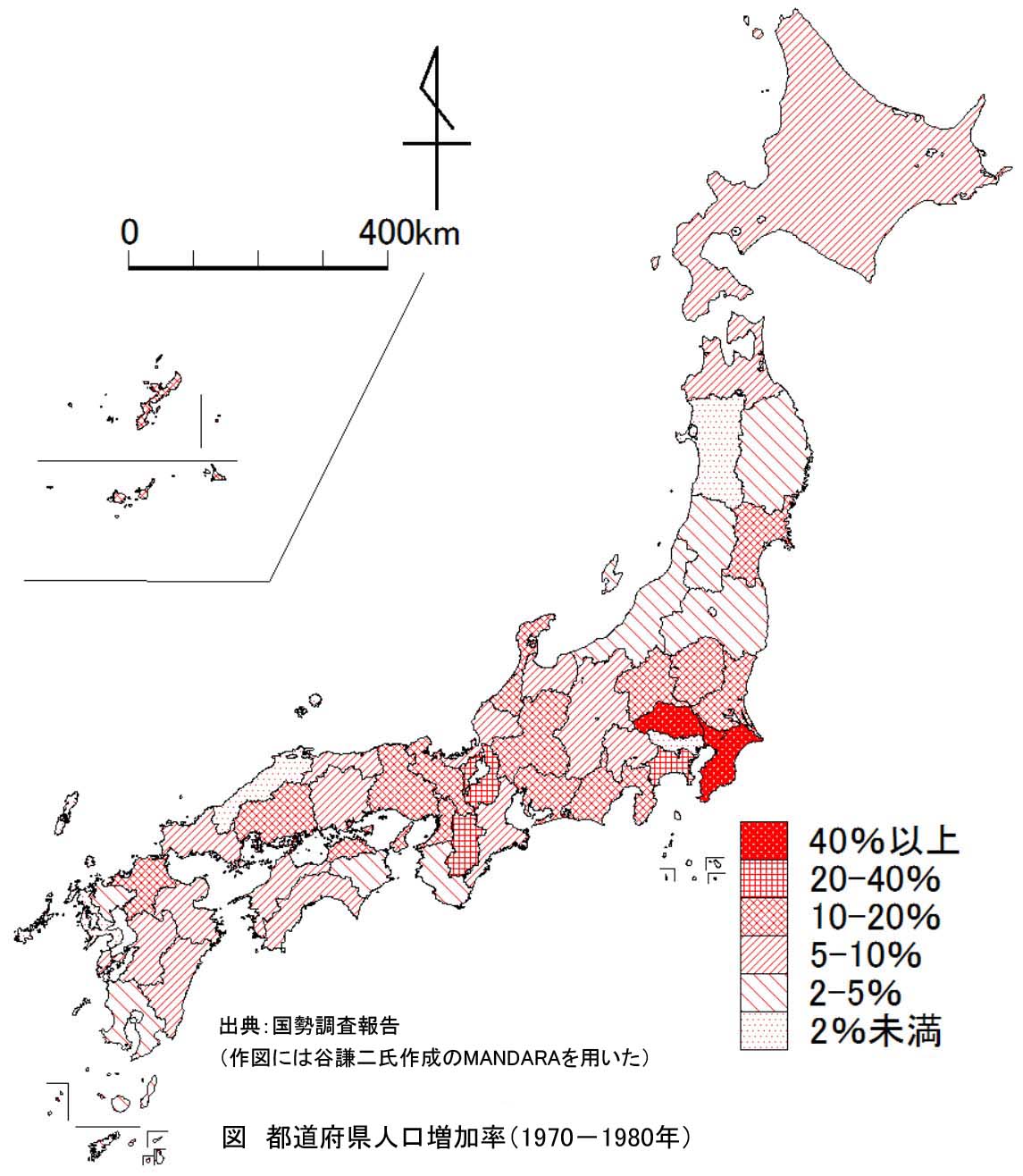 Uターン・Jターンとみられる人口増加が県の単位で顕著にあらわれるようになったのは、高度経済成長期後の1970年代になってからです。地方部への人口移動がみられるようになった背景には、東京都を中心とする経済活動の停滞と、相対的に地方部の経済がそれなりに好調であったことがあげられます。
