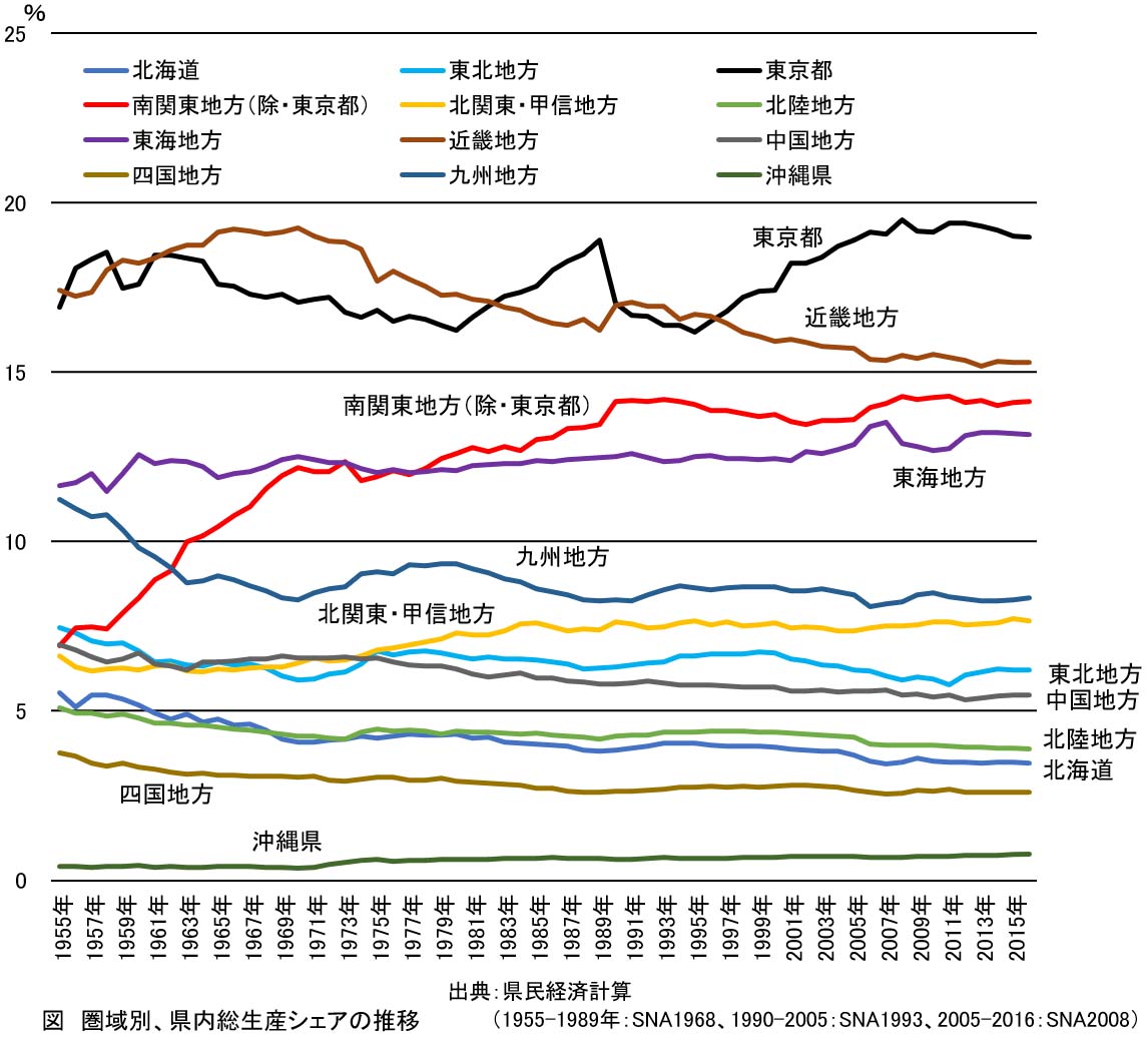県内総生産の東京都のシェアは、1960年代を通して縮小し、代わって東京都以外の首都圏や近畿地方、九州地方のシェアが1960年代から1970年代にかけて大きくなっていきました。また1970年代からは日本の経済成長に陰りがあらわれてきます。
