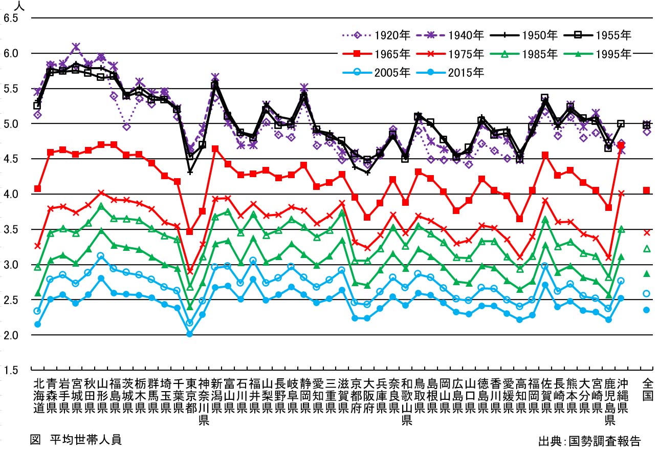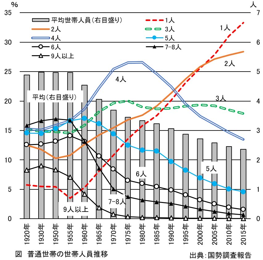世帯の小規模化は、戦後一貫した傾向です。普通世帯の規模は全国平均で、1950年と1955年に4.97人でしたが、1965年に4.05人、1975年には3.45人、さらに1995年2.88人、2015年に2.36人となりました。1世帯当たりの人員は、1950年では世帯人員が6人以上の世帯が38.4%でしたが、1960年30.4%、1970年14.3%と縮小していきました。