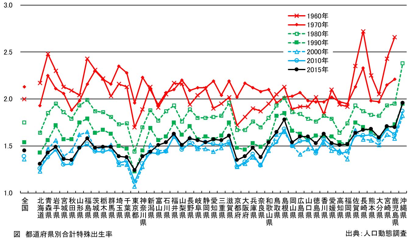 出生率低下は東京都が先行していましたが、その傾向が全国に広がっていきました。出生率は団塊の世代が生まれた1940年代後半に人口千人当たり30人を超えましたがその後は低くなっていきました。合計特殊出生率も、1947年に4.54でしたが、次第に小さくなり、1957年に2.04となりました。その後は、丙午の1966年の1.58を除けば、2.0をやや上回る程度で推移しましたが、1975年からは2.0を下回り、さらに1990年代からは1.5を下回ることとなりました。