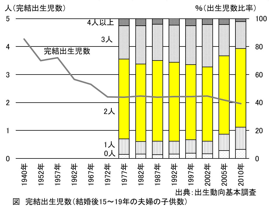 1971年度版「厚生白書」[*7-19]は、1960年以降平均世帯人員が縮小していると指摘し、さらに「一人っ子」が増えていると推定しています。実際の推移を「出生動向基本調査」でみると、結婚持続期間15~19年の夫婦(既婚女性)の子供数である完結出生児数は、1940年に4.27人、1952年に3.5人でしたが、1972年に2.2人となり、2005年までは2人以上を維持しました。2人を下回ったのは2010年です。