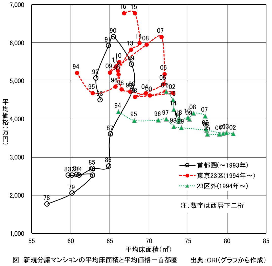 | 図 新規分譲マンションの平均床面積と平均価格(首都圏) | 図 新規分譲マンションの平均床面積と 平均価格(近畿圏) |