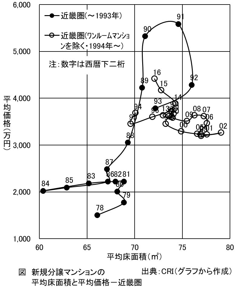「CRI」[*9-14]によると、首都圏の分譲マンションの購入者は、1985年ごろまでは世帯主年齢が30歳前後までの比較的若い世帯が多く、年収も500万円未満で前住宅は持家以外である世帯が多かったとみられます。ところが1989年になると40歳前後以上で年収が600万円以上、前住宅が持家という世帯が多くなりました。若くて持家を初めて取得する世帯を一次取得世帯と呼びますが、一次取得が困難となり、高所得で持家などの資産を保有する世帯しか分譲マンションを購入できなくなってきました。近畿圏でも、首都圏ほどではないものの状況は同様でした。