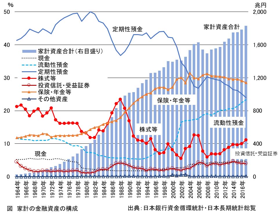 日本銀行の「資金循環統計」によると、個人(家計)の金融資産は、バブル経済期直後に増加が鈍り、リーマンショックをきっかけとした金融危機後には減少しましたが、長期的には増加し続けています。資産増加の鈍化、あるいは減少の時期は、いずれも全資産に占める株式等の比率が低下しています。株式等の目減りや他の資産への転換が原因とみられます。逆に、株式等の比率が高まったバブル経済期や2000年代前半には、資産の増加率が大きくなっています。
