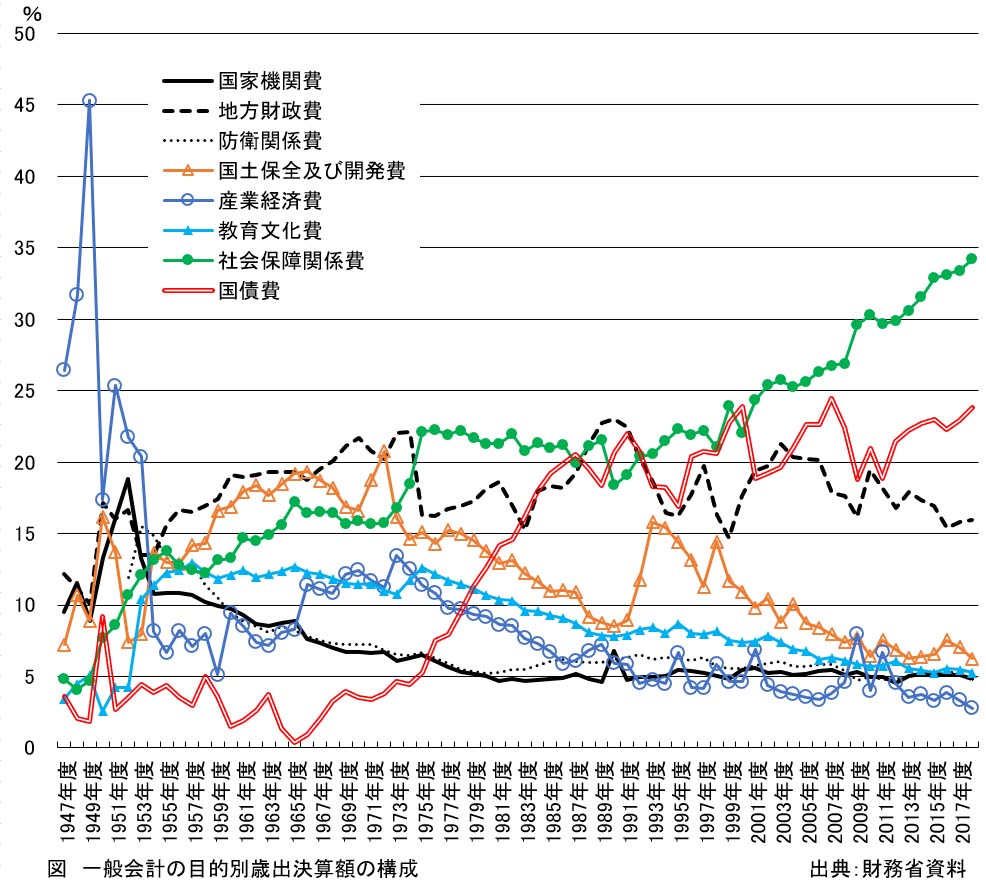 日本の財政支出は、高度経済成長期までは公共投資の占める割合が15~20%、産業経済費が10%前後、教育文化費が十数%など、投資的歳出の割合が高かったとみられます。経済復興と発展のための国土基盤形成と産業育成、人材育成に重点を置いていたといえ、空前の経済成長が達成されました。ところが高度経済成長期後の1970年代半ばから、それらの支出がいずれも縮小し始め、代わりに社会保険や社会福祉、医療などの社会保障関係費の比率が2割を超えるようになりました。