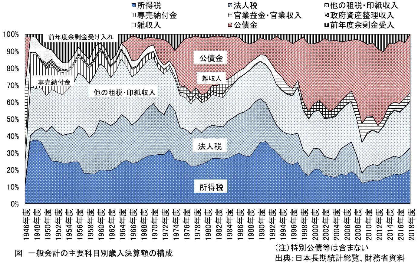 国の税収は、バブル経済期までは増加し、1991年には60兆円を超えました。しかし1960年代に歳入の10%前後だった国債は、1970年代半ばから歳入の30%程度に膨張し、国債の償却費である国債費も1980年代後半から20%前後となりました。国債はバブル経済期に10%程度に縮小したものの、財政赤字は続いており、財政健全化のために1989年に3%の消費税が導入されました。