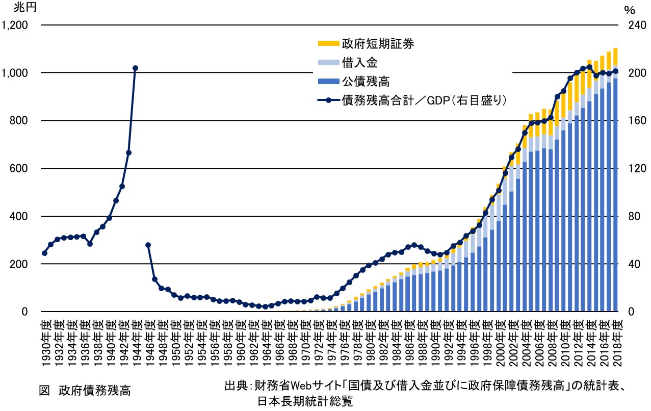 政府債務残高は1990年ごろから急伸しました。国内総生産に対する公債や借入金などの債務残高比率は、戦時中は別として、2000年ごろまでは100%まででしたが、2000年ごろからは100%を超えてきました。近年では200%にまで増大してきています。また240%に達しているという資料もあります[*10-11]。