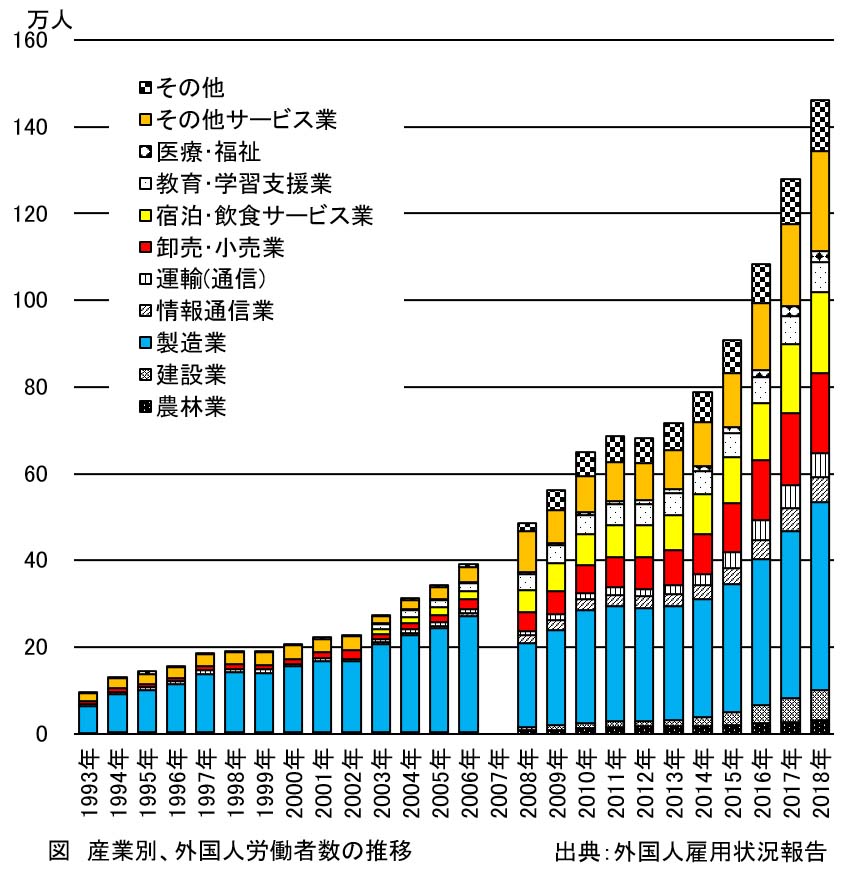 同調査の1993年の外国人労働者数は9.7万人ですが、記述中には推計で60万人とされ、外国人労働者の全体像は必ずしも明らかでない、とあります。同調査の外国人労働者数は、調査開始以降、増加の一途をたどっており、2010年に60万人を超え、2018年には140万人を超えました。