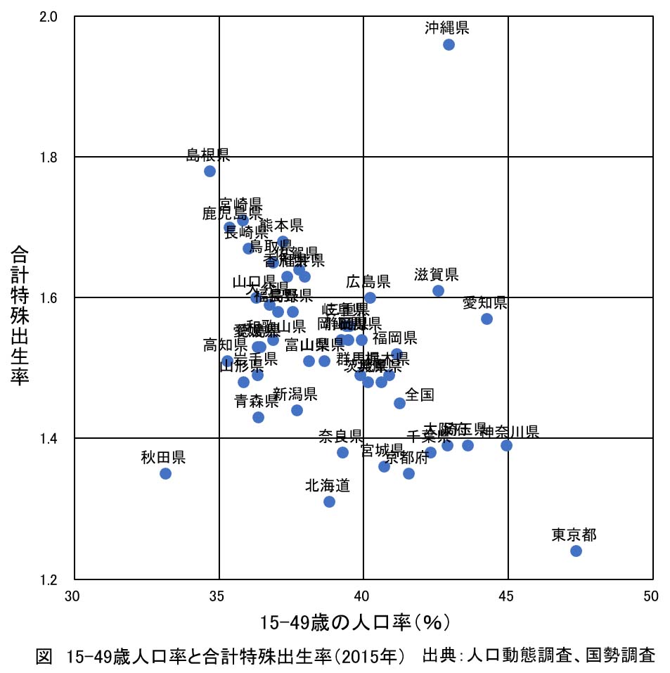 出産年齢とされる15~49歳の人口率と、合計特殊出生率との2015年時点での関係をみると、都市部では15~49歳人口率が高いにもかかわらず合計特殊出生率が低い傾向にあります。都市部の典型は東京都です。15~49歳人口率は47%で全都道府県の中でもっとも高く、合計特殊出生率は1.24でもっとも低くなっています。都市部では、転入などもあって若年層が多いのですが、それにもかかわらず出生が抑制されています。