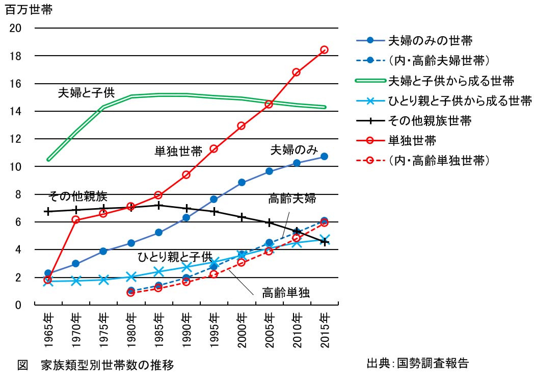 平均世帯人員は、1950年代までは約5人でした。その後減少し続け、2015年は2.4人となりました。3人以上の世帯は、減少もしくは停滞し、2人世帯も2000年以降は微増、1人世帯のみが増加し続けています。また高齢夫婦世帯やひとり親と子供などが増え続ける一方で、夫婦と子供の核世帯数は1990年ごろから減少し始めました。